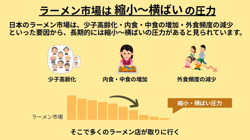 まず前提として、一風堂が戦っているラーメン業界の環境を整理しておきましょう。日本のラーメン市場は、少子高齢化や内食(自炊・中食)の増加、外食頻度の減少といった要因から、長期的には縮小〜横ばいの圧力があると見られています。コロナ禍を経て「ラーメンを出していれば自然に売れる時代ではない」という現実は、より鮮明になりました。