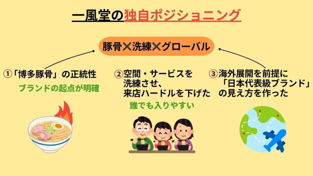 一風堂のポジショニングの肝は、次の3点に集約できます。