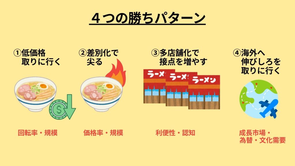 この環境下で、多くのラーメン店が取りにいく“勝ちパターン”は、大きく分けると次の4つです。