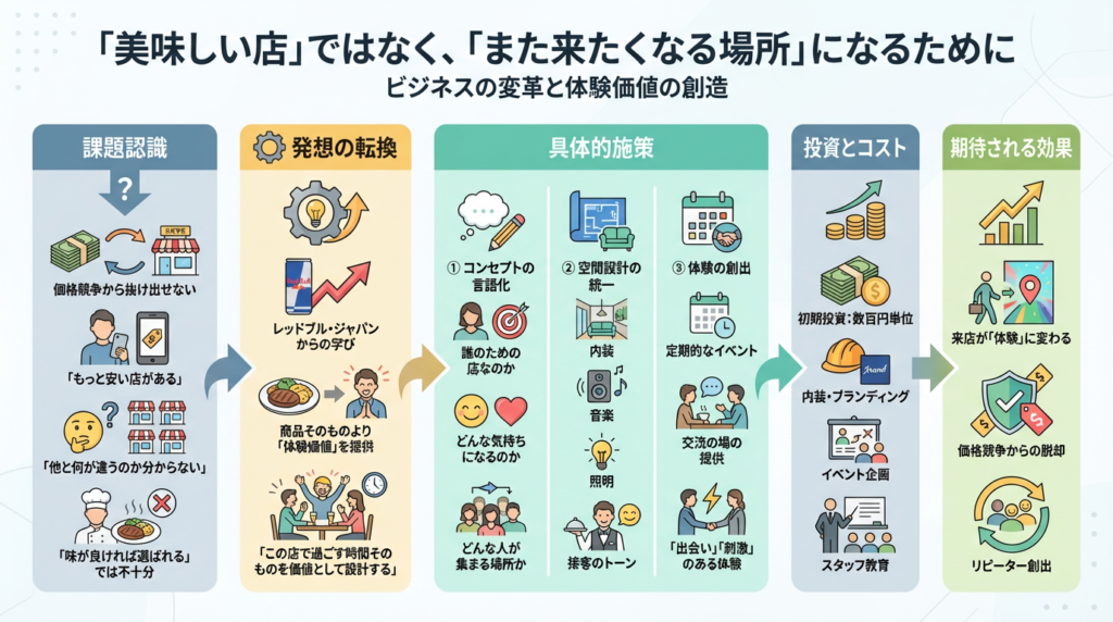 レッドブルがドリンクを通じてライフスタイルを提案したように、飲食店も「時間の過ごし方」をデザインすることが重要です。内装、音楽、照明、スタッフの言葉遣いまで含めて統一された体験は、他店との差別化につながります。