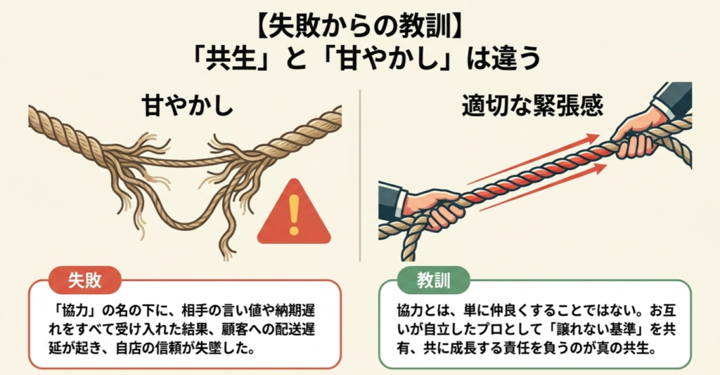 初期の頃、「共生」を意識しすぎて、相手の言い値や納期遅れをすべて「協力」の名の下に受け入れてしまったことがあります。