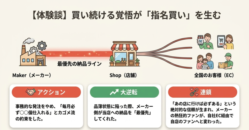 しかし、私たちが「苦しい時も継続して仕入れる」という約束を守り続けていたため、メーカー側も「私たちの店」への納品を最優先してくれたのです。