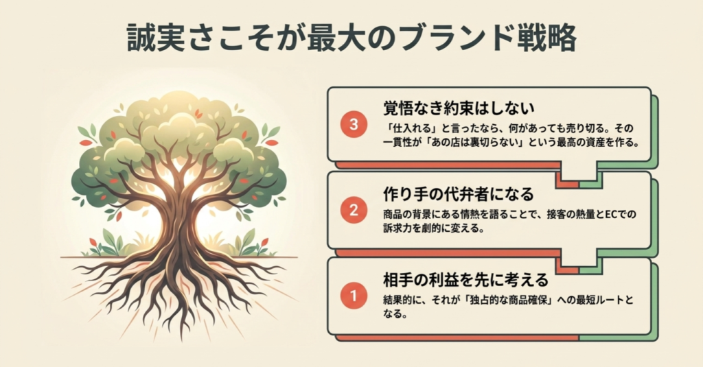 「どこでも買える時代」だからこそ、「あなたから買いたい」「この店に置いてほしい」と思われる関係性が、店を10年、20年と支える本当の資産になります。