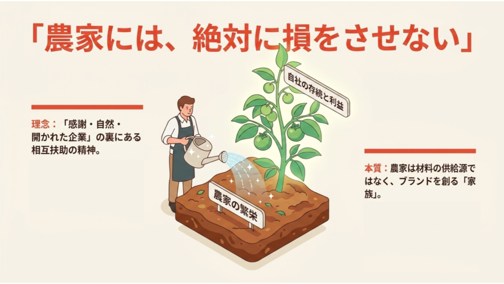 カゴメにとって、農家は「材料の供給源」ではなく「ブランドを共に創る家族」です。 「相手が豊かになってこそ、自分たちも存続できる」。