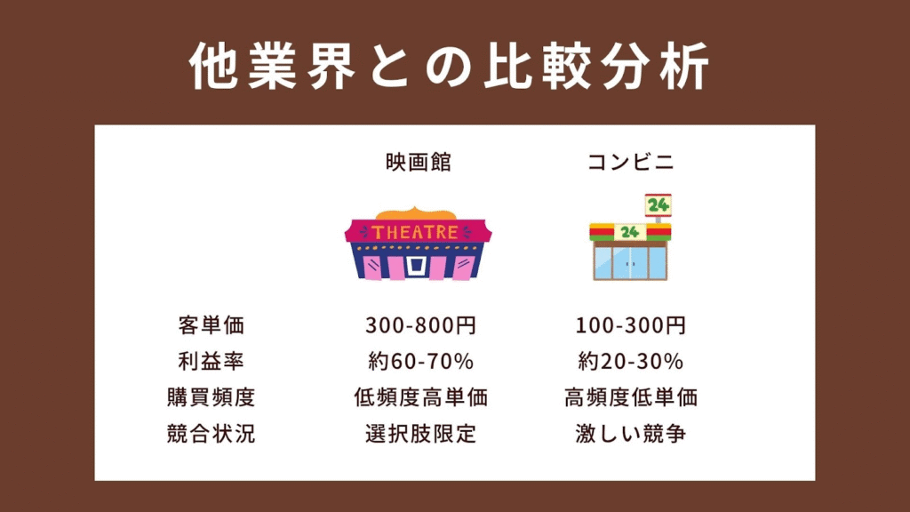 このように映画館は、日常的な利便性を重視するコンビニとは異なり、“特別な体験価値”を提供することで収益を高めるモデルであると言えます。
