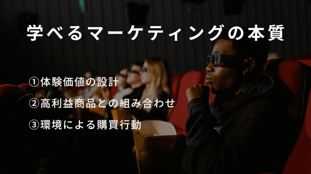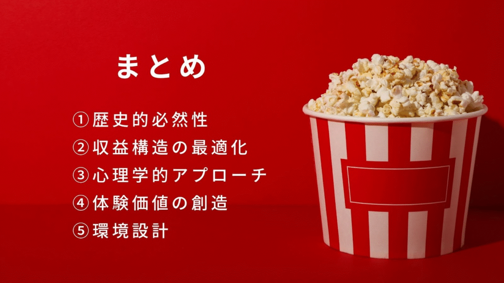 映画館のポップコーンは、これらすべての要素を100年近くにわたって洗練し続けてきた、マーケティングの教科書とも言える存在なのです。