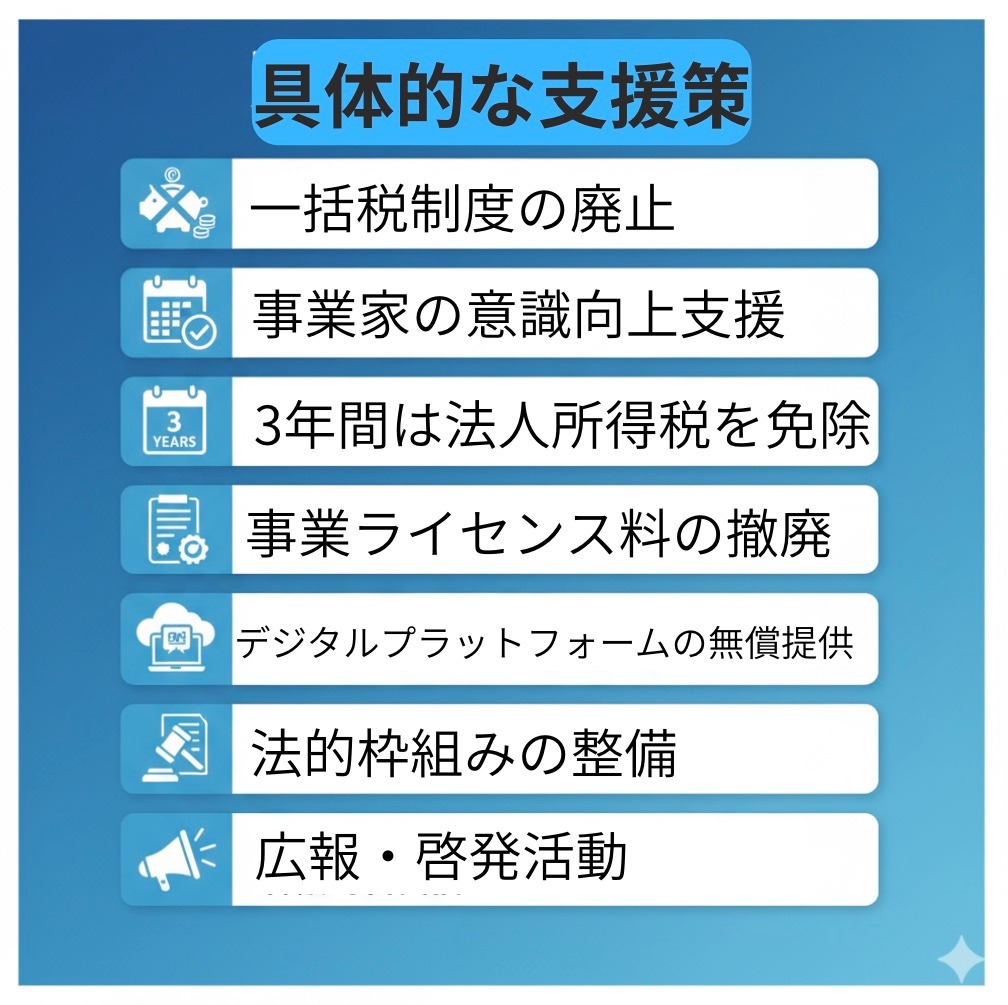 同時に、国家目標としては「2030年までに企業数を100万社増やす」という達成目標も掲げられており、その文脈の中で、単なる量的拡大ではなく、質的な「市場のルールに則って持続可能に成長する事業体」を育てることを意図しています。