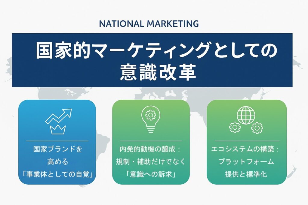 その構図こそ、「自らの価値とブランドを確立する意識改革=マーケティングそのもの」であり、国全体を巻き込んだマーケティング施策と言えるでしょう。