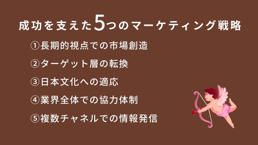 バレンタイン×チョコレートの事例は、マーケティングの最高峰とも言える「文化創造」を成し遂げた稀有な成功例です。